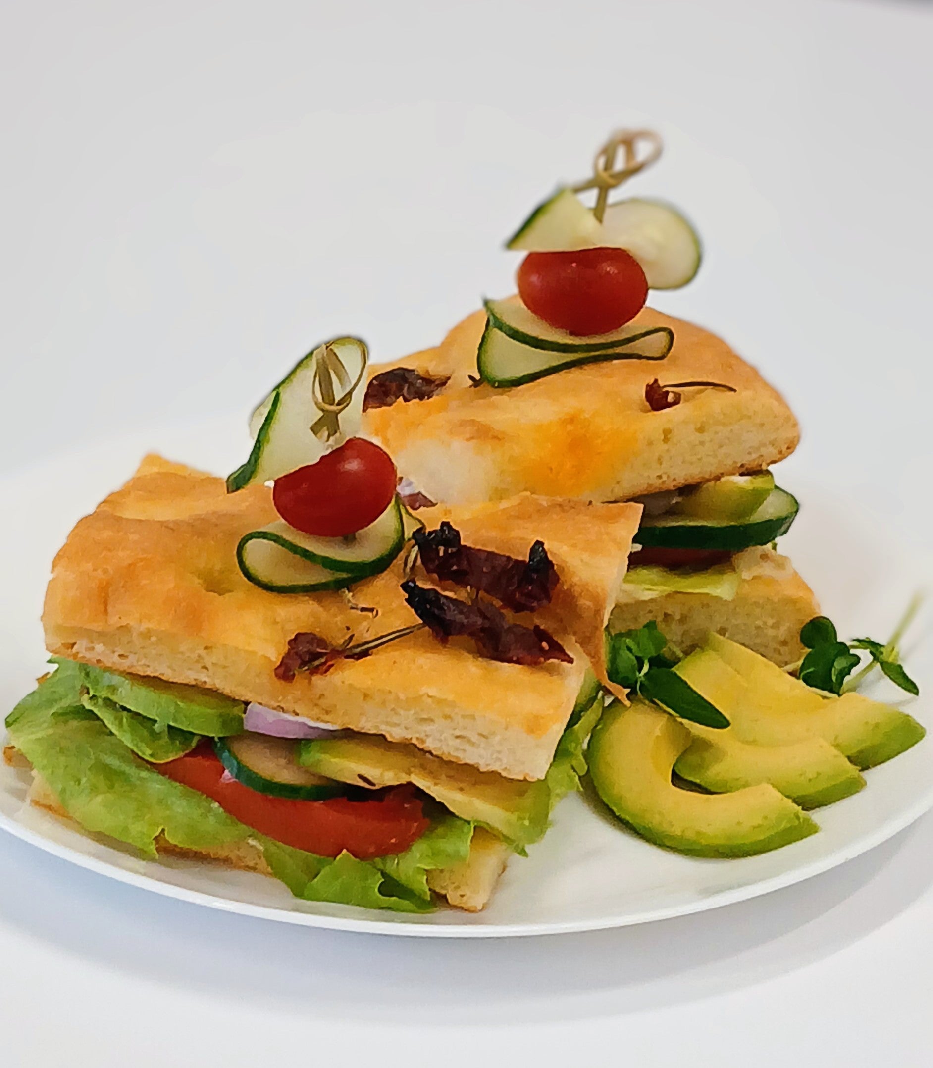 These focaccia bread sandwiches offer a variety of options, including roast beef, chicken, and veggie. Made with fresh ingredients, they provide a delicious and satisfying meal.